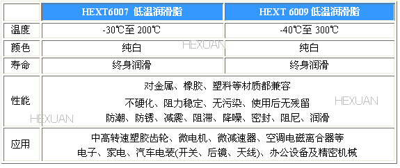 附注:以上兩種低溫潤滑脂,HEXT 6009低溫性更出色,性能上也更高一籌,而HEXT 6007低溫潤滑脂其性價比則更高,兩者都屬于環保性產品,可放心使用。