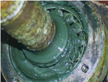 潤(rùn)滑脂成銹黃色呈膠體狀,并且軸承外圈明顯干涸變白,經(jīng)了解該潤(rùn)滑脂原來(lái)顏色為黃色。可推斷在其然后過(guò)程中因軸承生銹,摩擦沒(méi)有得到很好的控制導(dǎo)致油脂和銹跡混合變色。