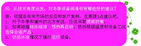 | 答:這次主要是解決冬季常見的潤滑油脂結冰結凍的問題,主要是戶外作業的設備和極端天氣情況運轉的設備。 |